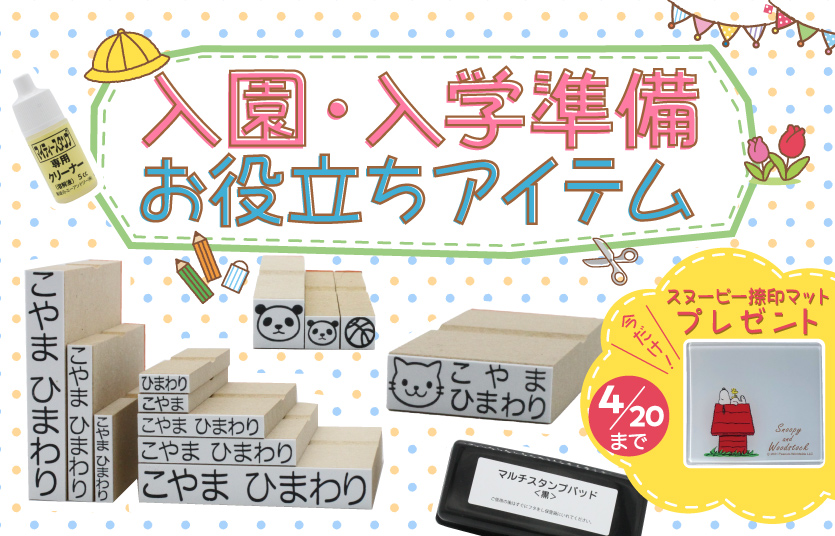 入園・入学グッズへのお名前付けに便利なスタンプセット、印鑑セットなどをピックアップしました。