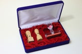 実印または銀行印として使用可能な18mm印鑑と21mm角印の2本の印章、組み合わせゴム印、別珍ケース付きの4点セットです。